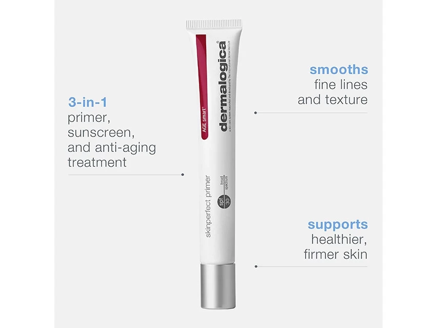 Dermalogica AGE Smart Skinperfect Primer SPF 30 perfectly preps your complexion for makeup application while nourishing your skin with advanced anti-aging peptides and antioxidants. Silicones and soy protein in this formula create an instantly smooth and even surface for makeup, while allowing active ingredients to penetrate deeply into skin for maximum benefit. Peptides help stimulate collagen production in the skin to build firmness and elasticity, while titanium dioxide and zinc oxide provide powerful mineral protection against the sun’s damaging UV rays.