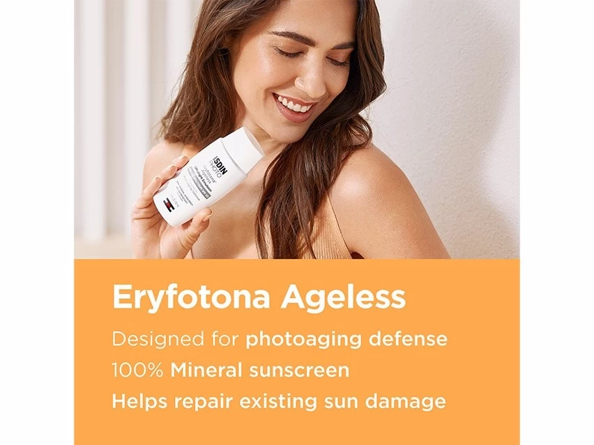 ISDIN Eryfotona Ageless Ultralight Tinted Mineral SPF 50 Sunscreen defends skin against sun damage while addressing fine lines and wrinkles.