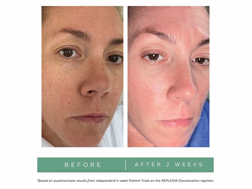Clinical results of a 4 week consumer perception study using the Replenix Discoloration Regimen, which includes Glycolic Acid Resurfacing Cleanser, Glycolic Acid 10% Resurfacing Peel, Vitamin C Pro Collagen Serum, Brightening Eye Cream and Pigment Correcting Brightening Cream:
